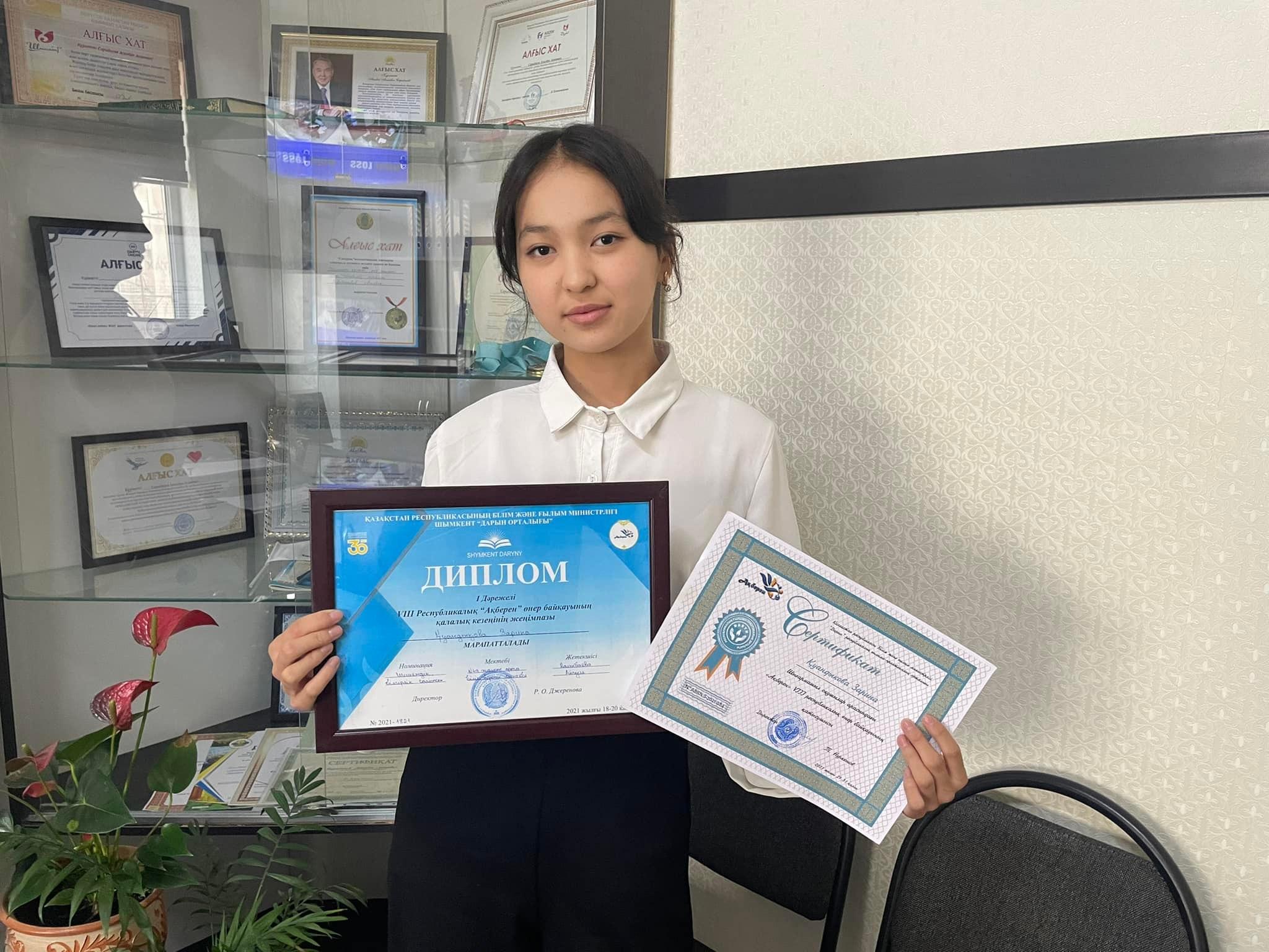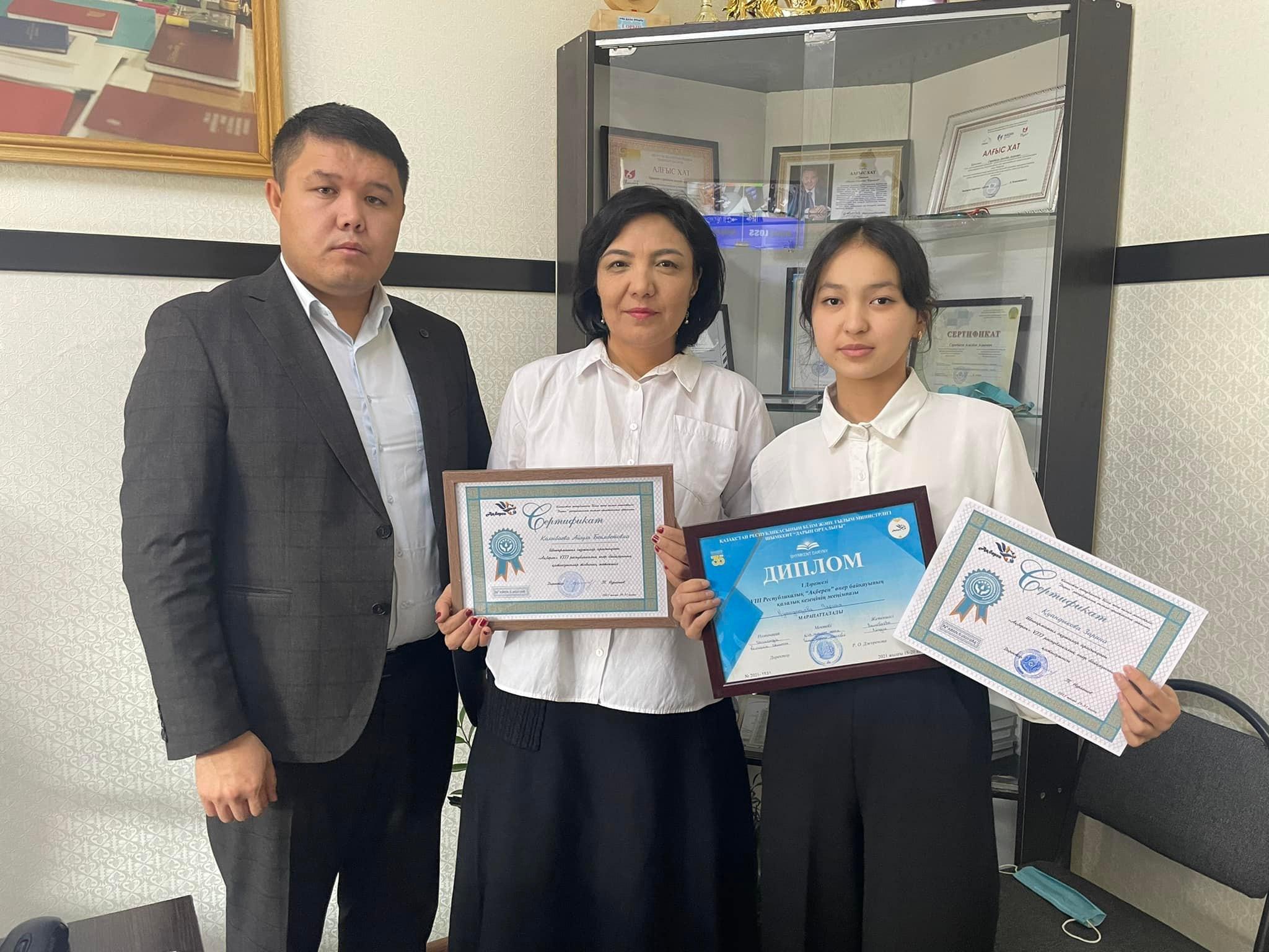 №49 жалпы орта білім беретін мектебінің 10в сынып оқушысы Қуандықова Зарина, жетекшісі қазақ тілі мен әдебиеті пәнінің мұғалімі Калыбаева Айгүл Vlll Республикалық "Ақберен" байқауының қалалық кезеңіне қатысып, "Шешендік, білгірлік" номинациясы бойынша l орын иемденді. Республика көлемінде Ақтөбе қаласында өткен байқаудан арнайы сертификаттармен марапатталып, мектеп мерейін республика бойынша асқақтатып қайтты. Шәкірт жетістігі-ұстаздың кәсіби біліктілігі мен шеберлігінің жемісі деп білеміз. Қуандықова Зарина 9-сыныпта "Мұқағали оқулары" байқауынан III орын иеленген болатын. Егеменді еліміздің болашағы,Зарина секілді жас білімдар жеткіншектері, Тәуелсіздіктің тұғыры биік болып, бейбітшілік бесігін тербеткен, талай асуларды бағындырған саналы ұрпақ болатындарыңызға зор үміт артамыз!